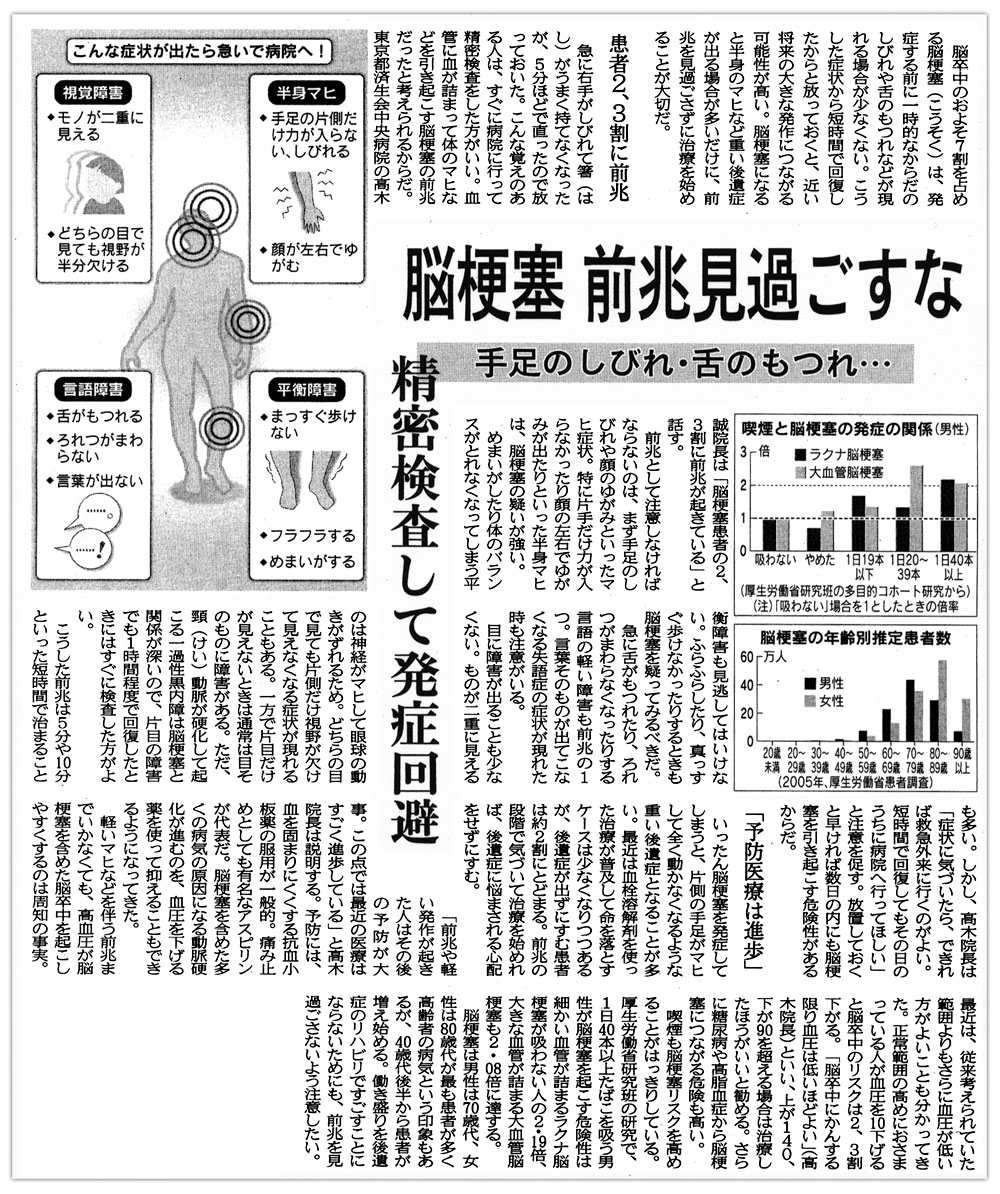 急に右手がしぴれて箸(はし)がうまく持てなくなったが、5分ほどで直ったので放っておいた。こんな覚えのある人は、すぐに病院に行って精密検査をした方がいい。血管に血が詰まって体のマヒなどを引き起こす脳梗塞の前兆だったと考えられるからだ。梗塞患者の2、3割に前兆が起きている。